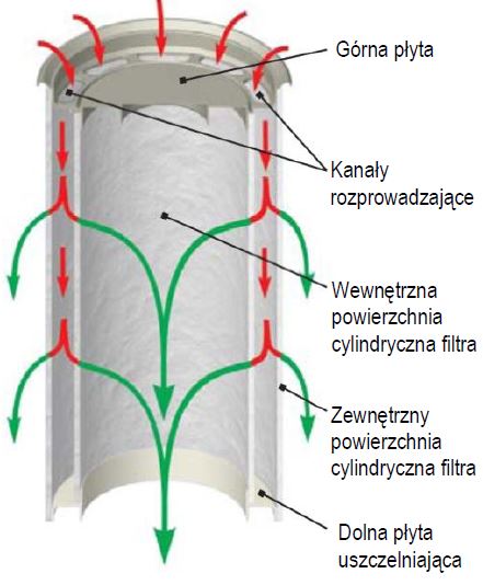 Element filtracyjny 3M DF składa się z dwóch warstw cylindrycznych połączonych z górną płytką rozprowadzającą płyn oraz dolną płytką uszczelniającą. Jak pokazano na schemacie, ciecz dopływa do górnej części filtra przez specjalne kanały rozmieszczone w górnej płycie filtra. Ciecz przepływa pomiędzy wewnętrzną i zewnętrzną cylindryczną powierzchnią włókniny filtracyjnej, a następnie przepływa przez samą włókninę filtracyjną oraz kosz podpierający na czystą stronę obudowy filtracyjnej.